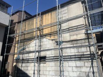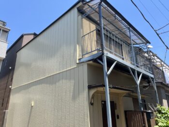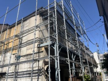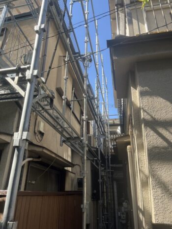 大建架設では、メインとして、改修の為の足場工事(外壁塗装)のための足場で、塗装・防水工事も一式で請け負いさせてもらっています。